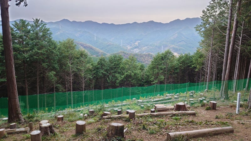 こちらは反対側の眺望、切られた杉たちが痛々しい(汗)。見えていた緑のネットはこの伐採したエリアを保護するためのものっだったようだ。こちら側には町並みはなく山々が見えていた。